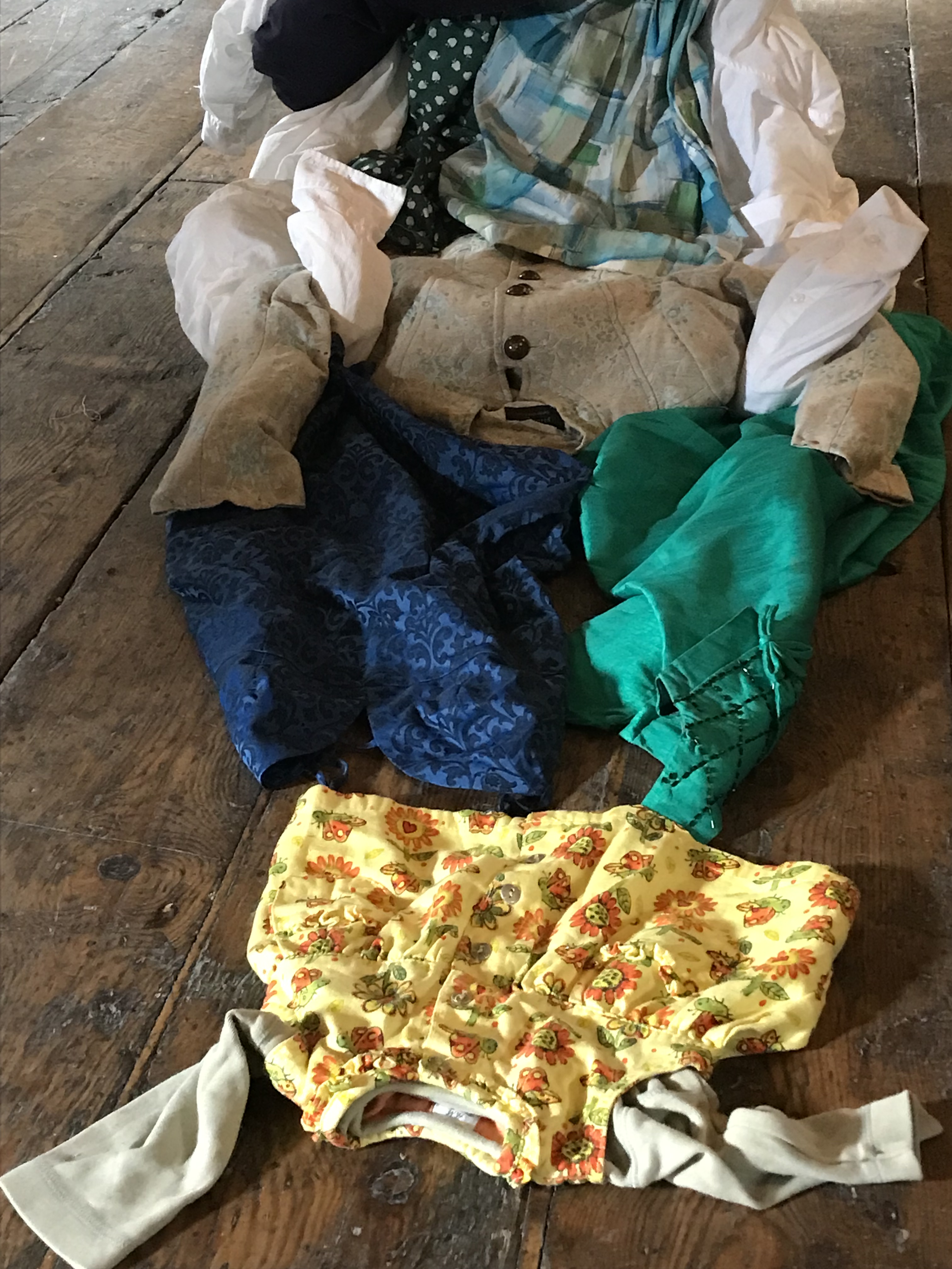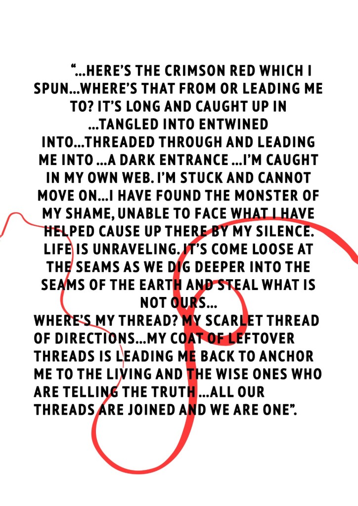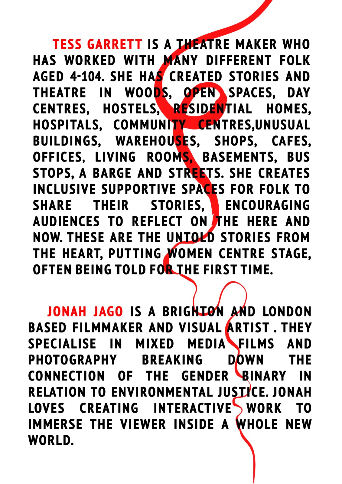 Ariadne’s Thread is a multimedia piece combining movement, immersive soundscape and projection which we created over a week’s residency at The Barge, Brighton Marina. Thirty folk who identify as female and non-binary worked with theatre maker Tess Garrett, textiles artist Gabby Dempster and film maker Jonah Jago to bring to life an exploration confronting our fears about the climate crisis. Each one of us became Ariadne with the moral dilemma of ‘Ariadnes thread’ of either escaping climate chaos by hiding away in the labyrinth created by a ball of red wool or going back up to the world to stand alongside those who have no choice – whose lives are already greatly affected by drought, hurricanes, tornadoes… Three of us wore an extraordinary coat made of repurposed secondhand clothes which evoked the image of people helping eachother – literally by holding onto sleeves to climb to safety. In creating this we were painfully aware that refugees arrive every week in tiny boats all along this coastline by the marina, to make new lives for themselves and their families, escaping war and climate change.